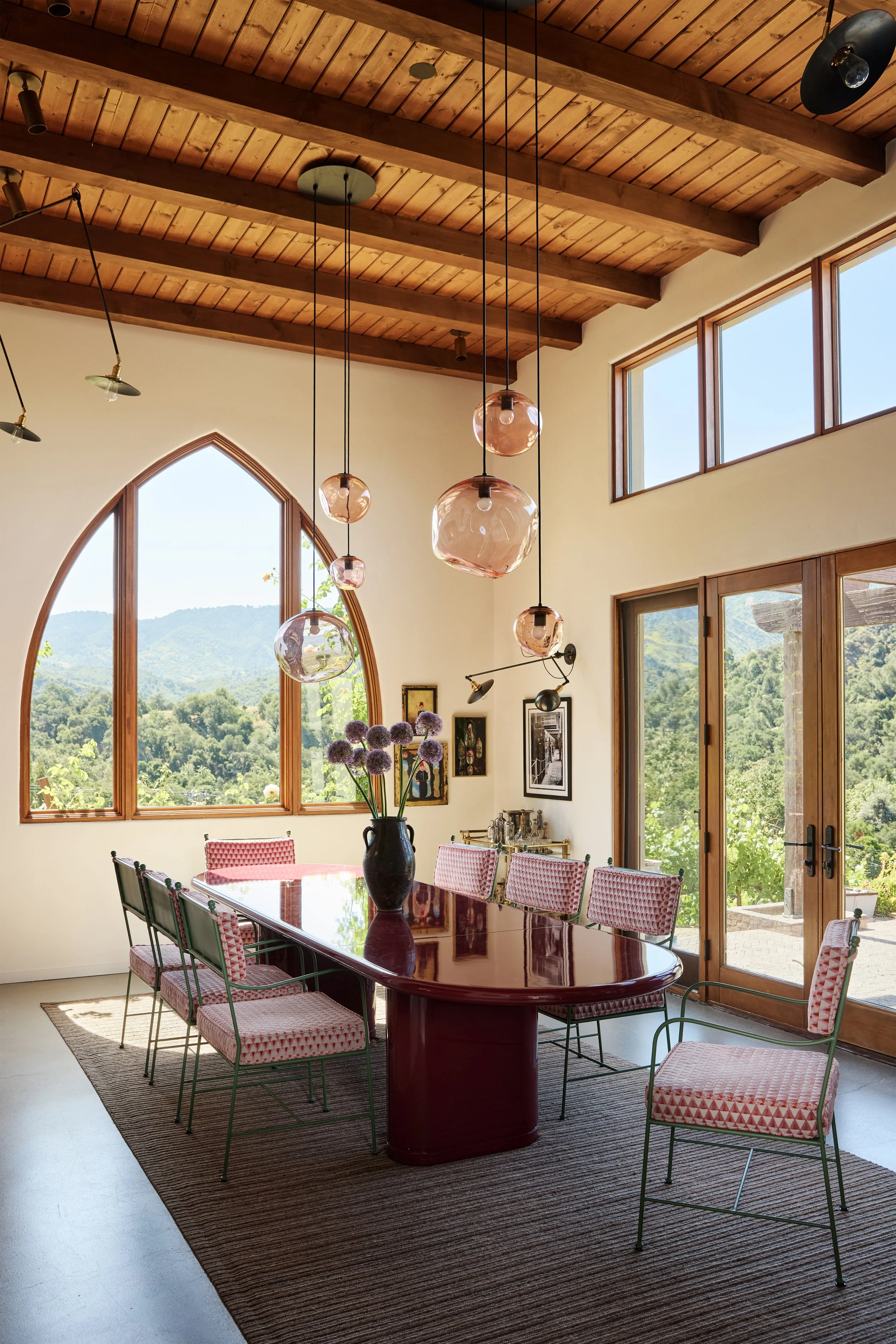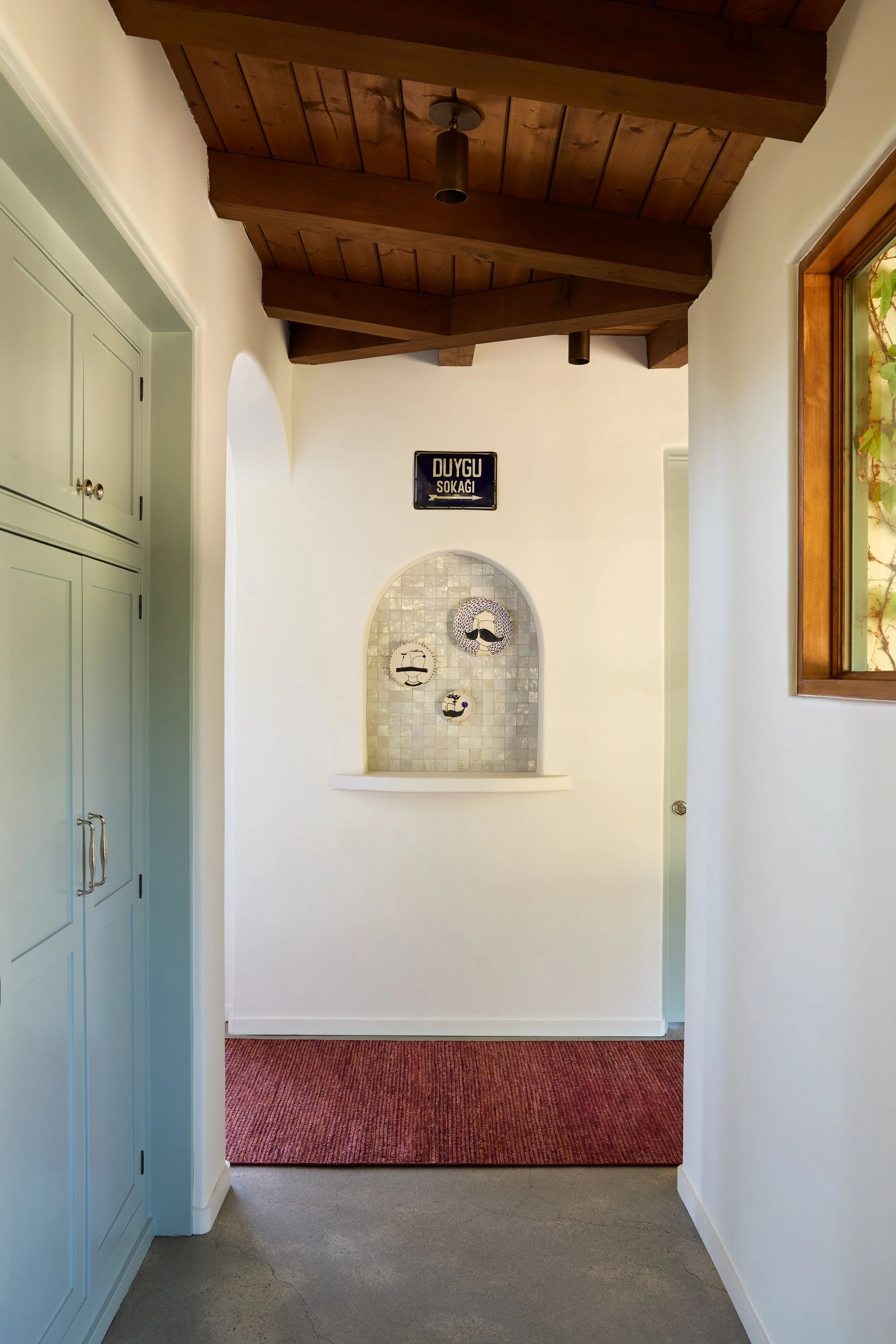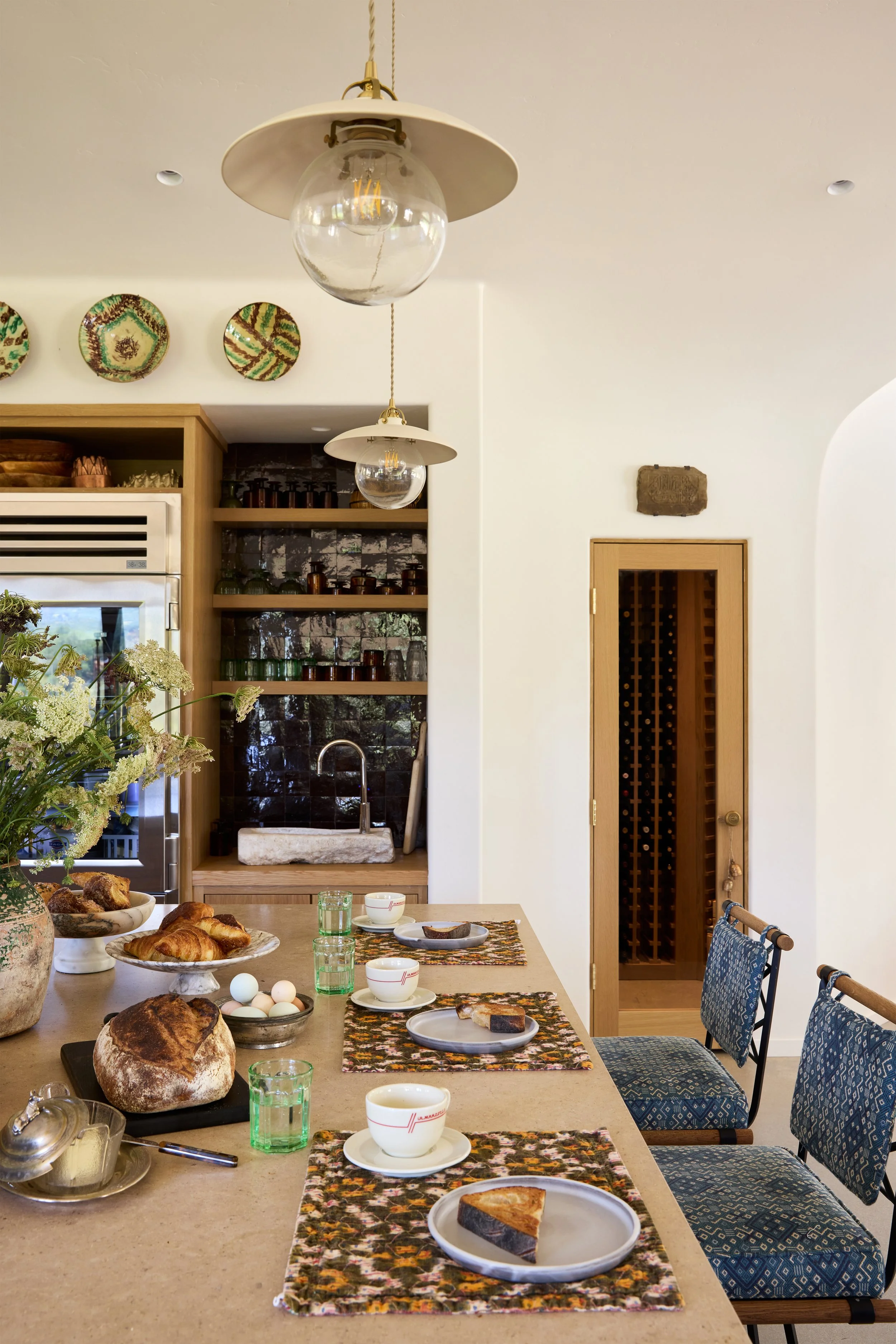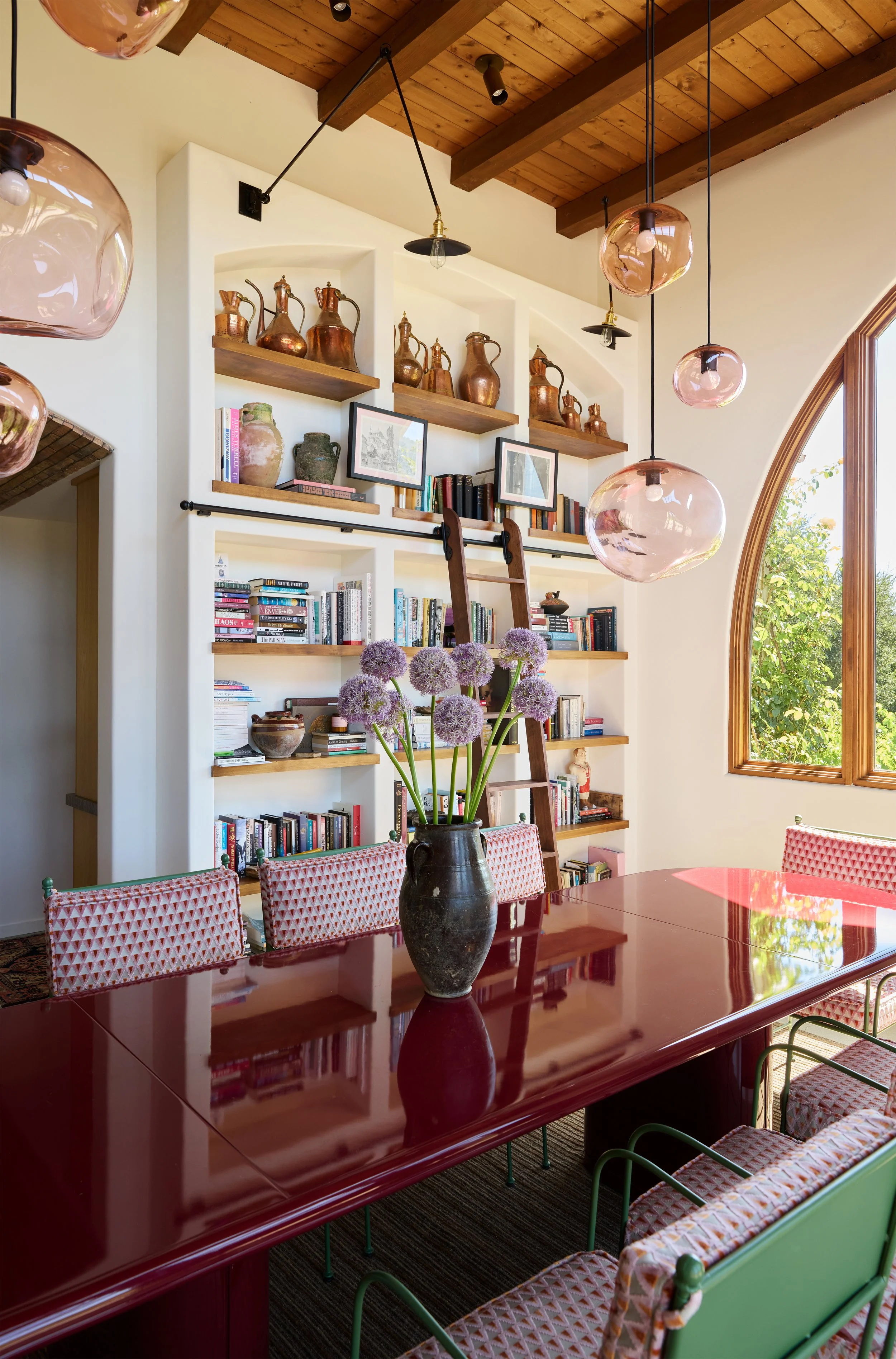 A home for a family that is well traveled, well read, and who is just as at home in the slow pace of a small country town in California as a fast paced global city like Istanbul. The couple has been steeped in Moorish Culture and History, but also has a penchant for English flair. Pink, terra cotta and the occasional wine tone became the leading actors against a backdrop of California oak tones and olive greens. We designed custom built ins to showcase their notable collection of Mediteranean ephemera, extensive book collections, and curios that have been acquired during their travels.